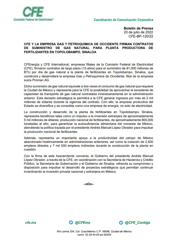 Pese a que no ha concluido la consulta indígena para la construcción de al planta de amoniaco en Topolocampo, las empresas filiales de la Comisión Federal de Electricidad (CFE), CFEnergía y CFE International, firmaron un convenio de largo plazo, por 15 años, con la empresa Gas y Petroquímica de Occidente (GPO), filial de la empresa suiza Proman AG, que construye la planta, para el suministro de 81 mil millones de BTU por día de gas natural.