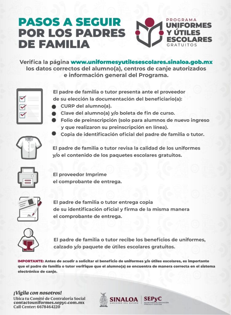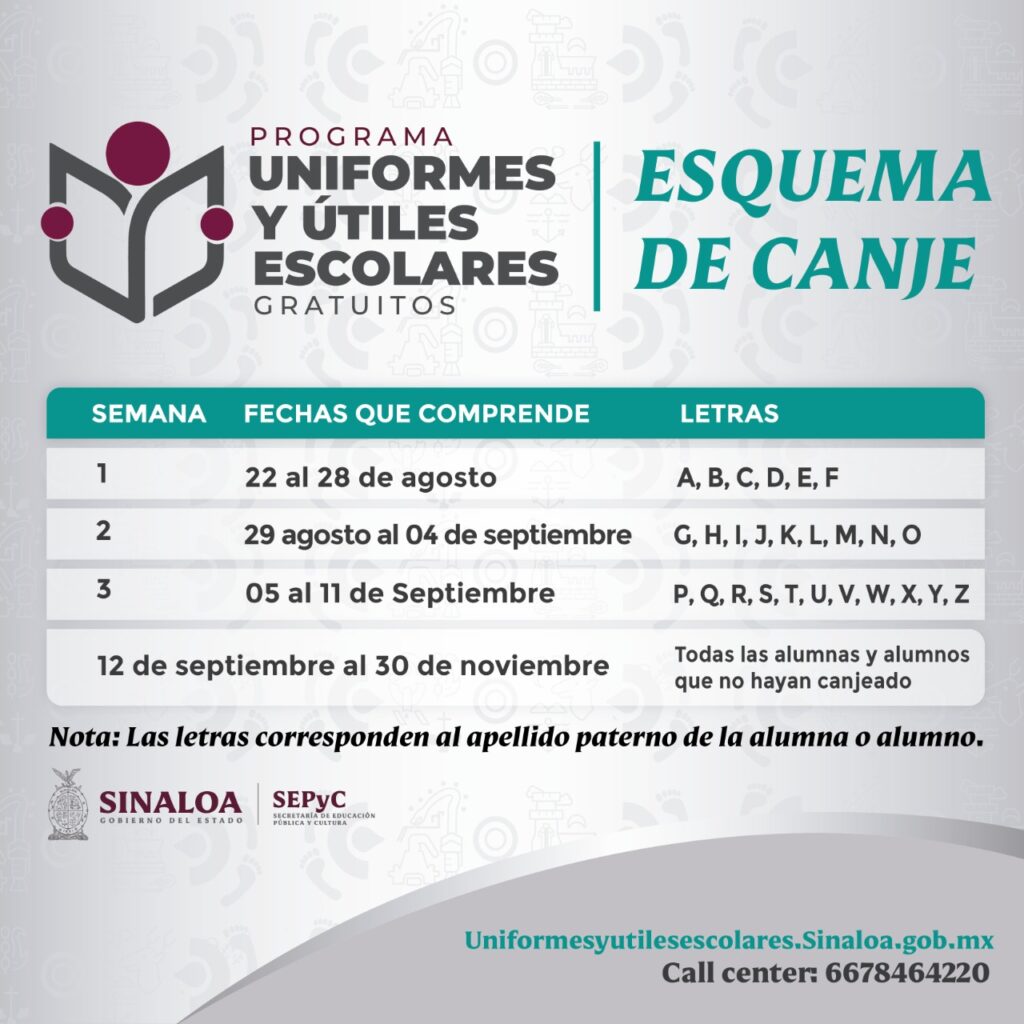 Antes de realizar el canje, mamás, papás y tutores deberán verificar que los datos de las y los alumnos sean los correctos, ingresando al portal uniformesyutilesescolares.sinaloa.gob.mx. Ahí encontrarán además los centros de canje disponibles por municipio y la información general del Programa. También pueden llamar al call center (667) 846-42-20 en caso de requerir apoyo.