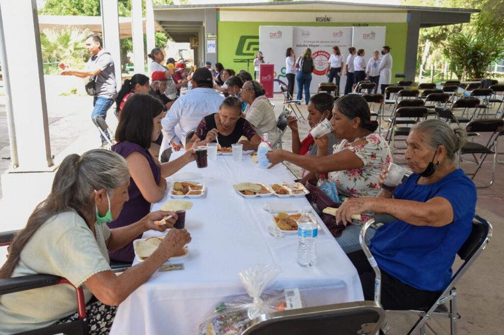 Los adultos disfrutaron de rico desayuno, postre, despensas alimenticias y un kit de gel antibacterial y cubrebocas.