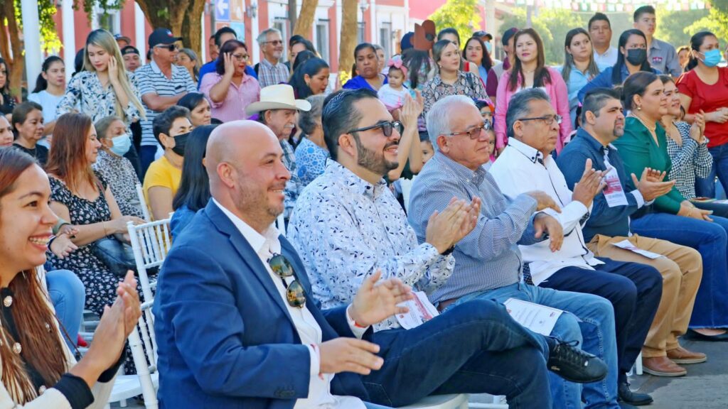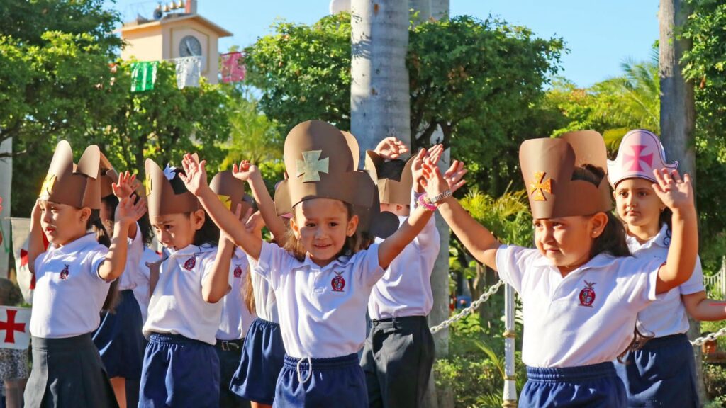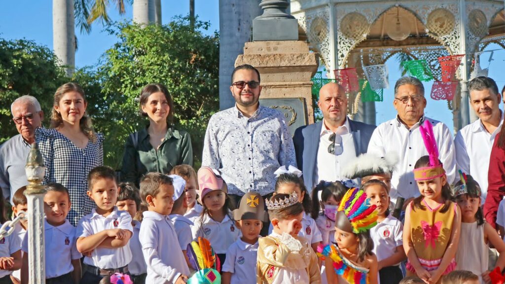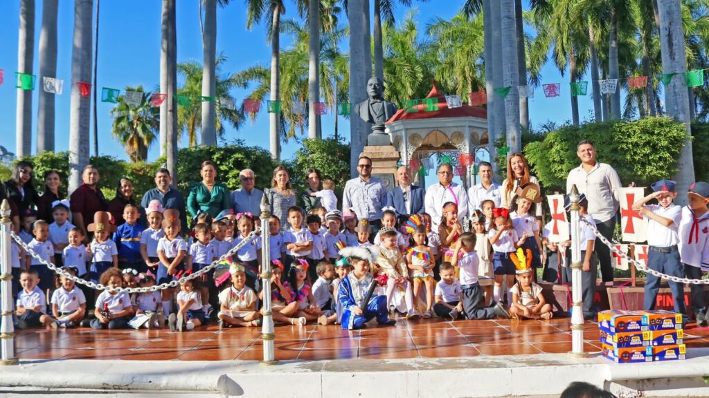 El programa estuvo a cargo del Jardín de Niños Cristóbal Colón y se realizó en el Hemiciclo Benito Juárez, frente al Palacio Municipal.
