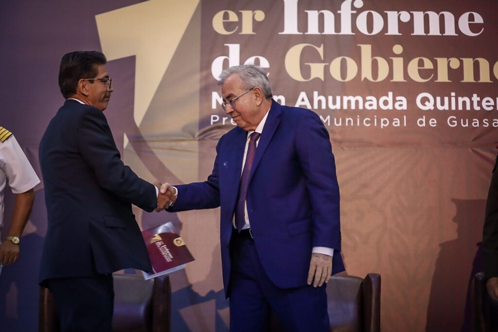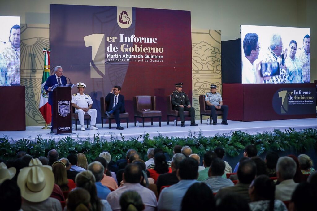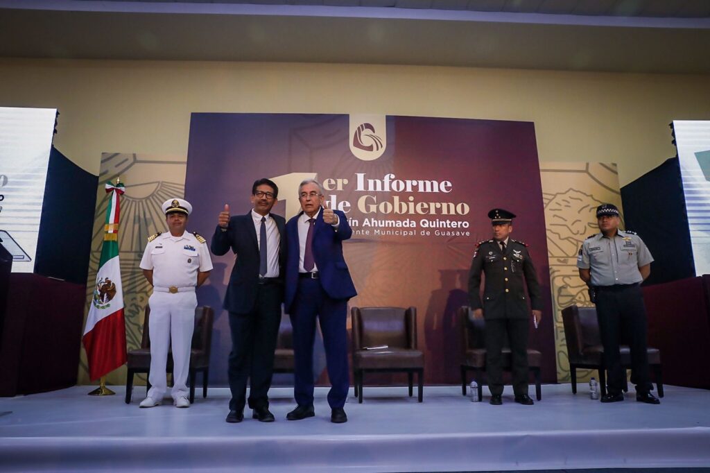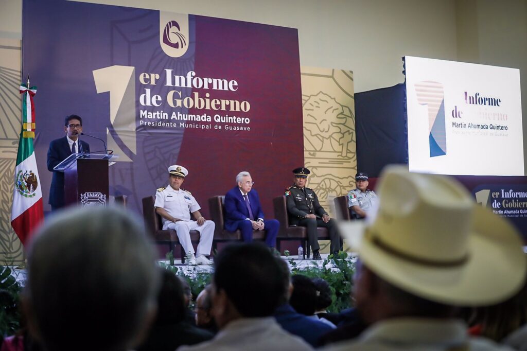 El mandatario estatal continuó con su asistencia a la presentación de los Informes de Gobierno de los alcaldes, pues anteriormente asistió al municipio de Badiraguato y luego a Ahome, correspondiendo ahora a Guasave, donde reiteró el apoyo a su presidente municipal, Martín Ahumada Quintero, con quien ha trabajado de manera muy coordinada para resolver las demandas de la ciudadanía y realizar obras de gran contenido social, que es el objetivo de su gobierno.
