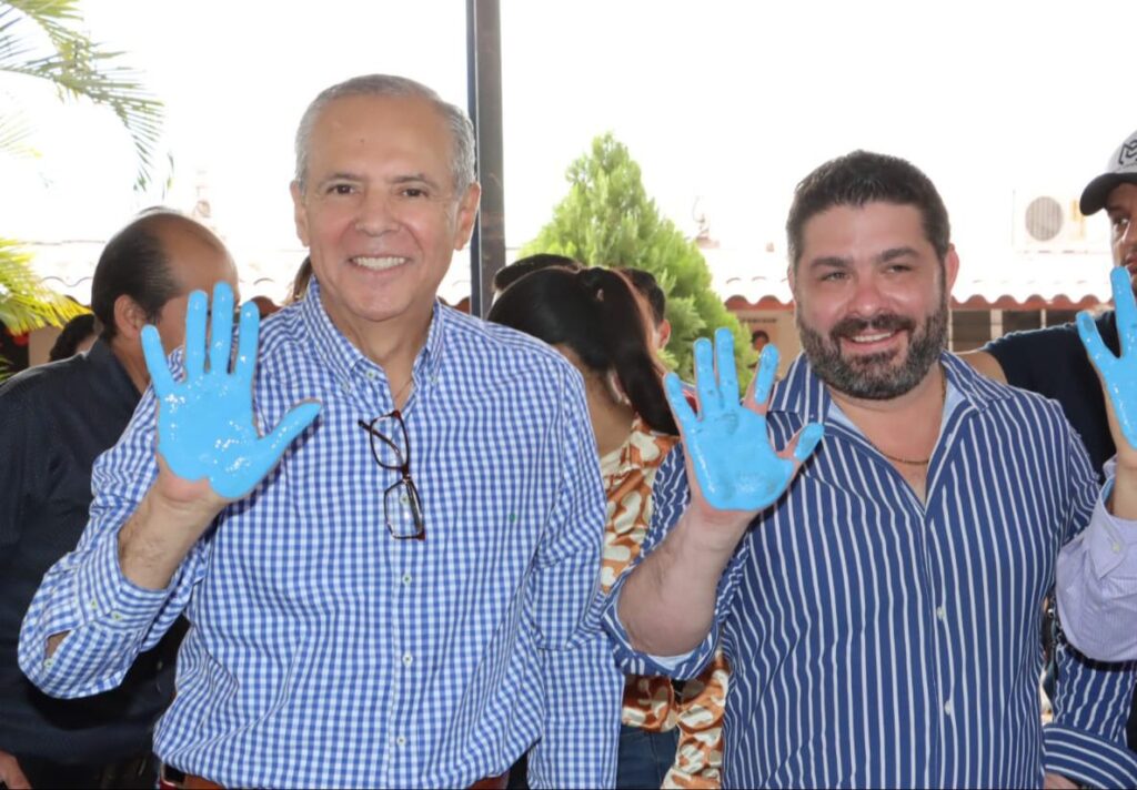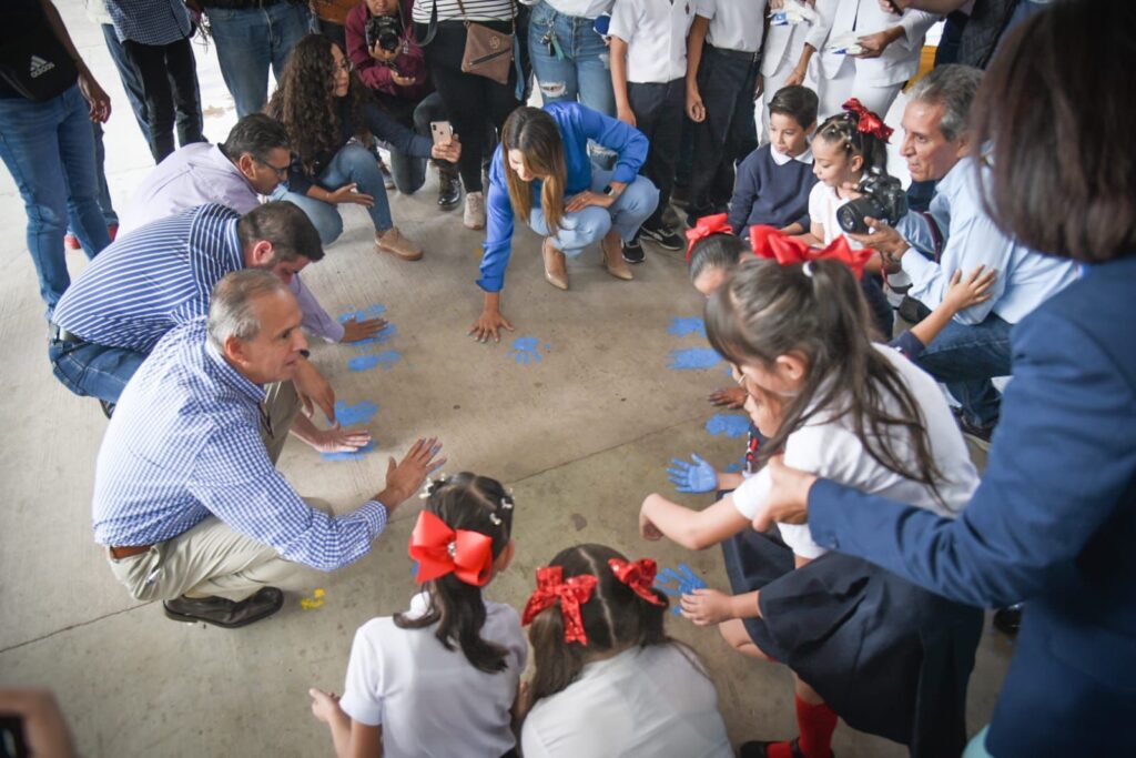 Los Mochis, Ahome, Sinaloa. Noviembre 14 del 2022.- El Alcalde Gerardo Octavio Vargas Landeros, presidió el programa del Día Mundial de la Diabetes en la escuela primaria Miguel Crespo Mariscal de la colonia Las Huertas de Los Mochis, donde, junto con los niños, funcionarios y comunidad escolar, plasmaron sus manos con pintura azul, en el centro de la plaza cívica del plantel.