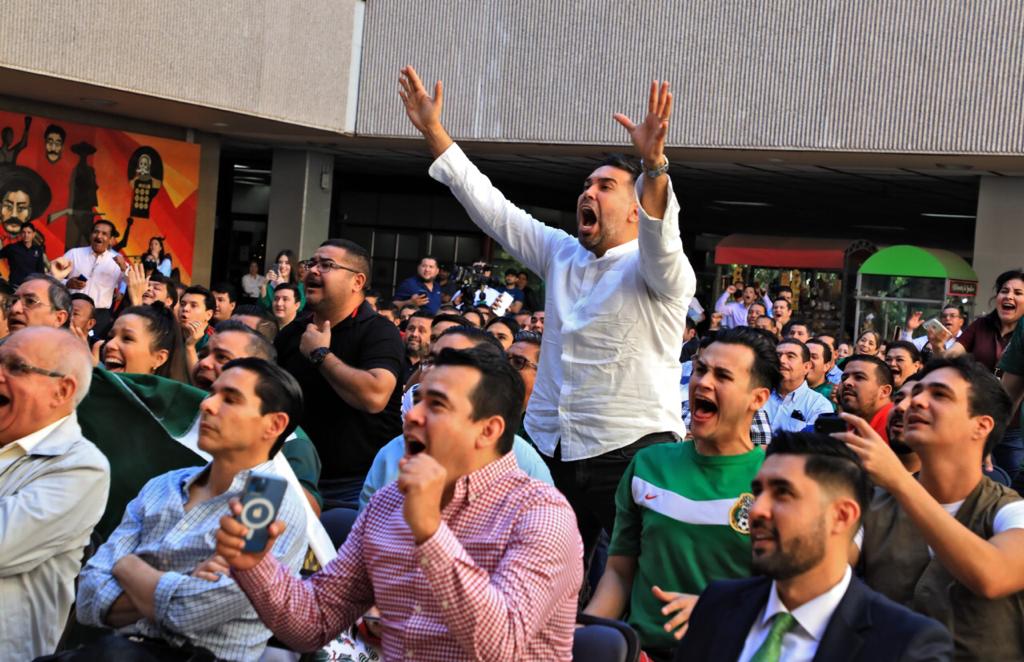 El mandatario estatal bajó a la explanada central de Palacio de Gobierno, donde fueron colocadas dos megapantallas para presenciar el debut de México, y en compañía de la mayoría de los secretarios de su gabinete, se dispuso a disfrutar de este cotejo, durante las dos horas que duró el partido.