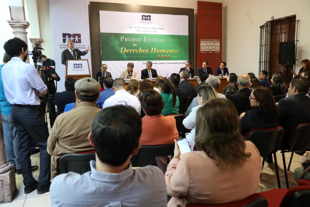 Culiacán, Sinaloa, a 09 de Diciembre de 2022.- En el marco del Día Internacional de los Derechos Humanos, instituido el día 10 de diciembre de 1948, fecha en que la Asamblea General de la Organización de las Naciones Unidas, adoptó la Declaración Universal de Derechos Humanos, esta mañana, el Gobernador Rubén Rocha Moya acudió a las instalaciones del Colegio de Sinaloa donde se realizó la ceremonia solemne de entrega del Premio Estatal de Derechos Humanos 2022, organizado por la Comisión Estatal de Derechos Humanos, que en esta primera e histórica entrega, galardonó a Mirna Nereyda Medina Quiñónez, líder del Colectivo de Rastreadoras de Desaparecidos de El Fuerte y la zona norte.