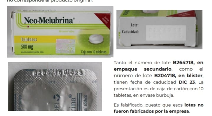 Ross Álvarez agregó que los medicamentos falsificados son: estomaquil, Buscapina®️ Compositum (hioscina/metamizol sódico) 10 mg/250 mg y Neo-Melubrina®️ (metamizol sódico) 500 mg.
