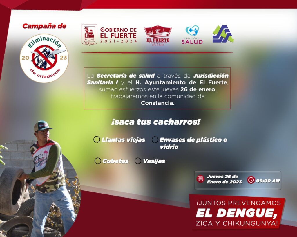 El Fuerte, Sinaloa, a 25 de enero del 2023.- Por indicaciones del Alcalde Gildardo Leyva Ortega, la Dirección de Salud Municipal, dirigida por la Dra. Grecia Acosta, en coordinación con la Dirección de Servicios Públicos Municipales, se encuentra en trabajo constante con la campaña de Eliminación de Criaderos, la cual consiste en pláticas de concientización, entrega de abate para depósitos de agua y limpieza de patios.