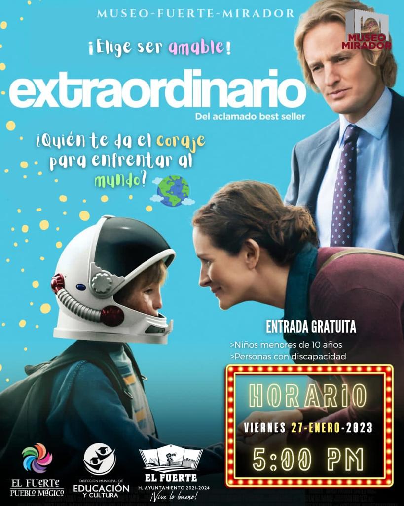 El Fuerte, Sinaloa, a 26 de enero del 2023.- El Ayuntamiento de El Fuerte, en coordinación con la Dirección de Educación y Cultura, hace una atenta invitación a toda la ciudadanía, para disfrutar del programa Viernes de Películas. Esta será la tercera proyección que se realiza, donde se podrá apreciar la obra “Extraordinario”, emotivo filme, que aborda temas de respeto e inclusión. La fecha es este viernes 27 de enero, en el interior del Museo-El fuerte-Mirador, en punto de las 5 de la tarde.