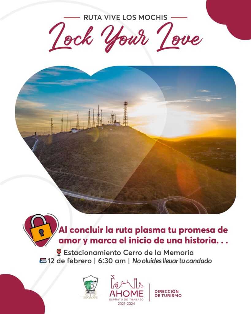 “Este mes del Amor y la Amistad, ruta Vive Los Mochis combina el senderismo con el amor, este domingo 12 de febrero se realizará un recorrido por el Cerro de La Memoria en esta ocasión al culminar el recorrido se tendrá una actividad relacionada con el 14 de febrero denominada Lock Your Love, en el que amigo y parejas podrán colocar un candado en el barandal de La Pérgola como señal de amor y amistad”, expresó Verónica Medel.