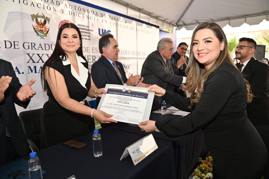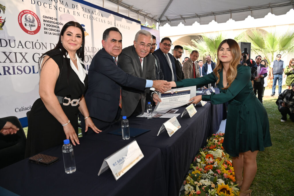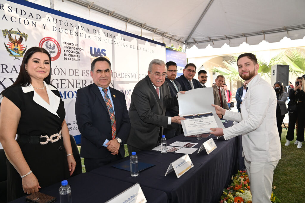 En los jardines del Hospital Civil de Culiacán y de manos del Rector, doctor Jesús Madueña Molina y del Gobernador Rocha Moya, recibieron sus constancias 34 profesionales de la salud, de ellos 4 de la Licenciatura en Optometría, 21 residentes en siete especialidades médicas, 8 egresados de cuatro subespecialidades y una de alta especialidad.