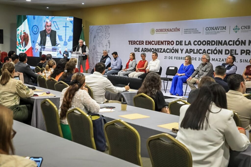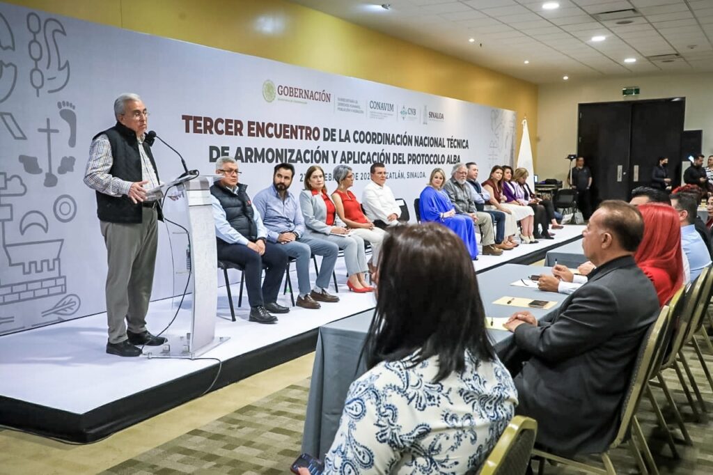 Mazatlán, Sinaloa, a 21 de febrero de 2023.- En compañía del subsecretario de Derechos Humanos, Población y Migración de la Secretaría de Gobernación, Alejandro Encinas Rodríguez, el gobernador Rubén Rocha Moya, puso en marcha el Tercer Encuentro de la Coordinación Nacional Técnica de Armonización y Aplicación del Protocolo ALBA, que congregó en Mazatlán a representantes de 12 Fiscalías Generales estatales, a fin unificar criterios para los mecanismos de búsqueda de niñas, adolescentes y mujeres que se encuentran reportadas como desaparecidas en México.