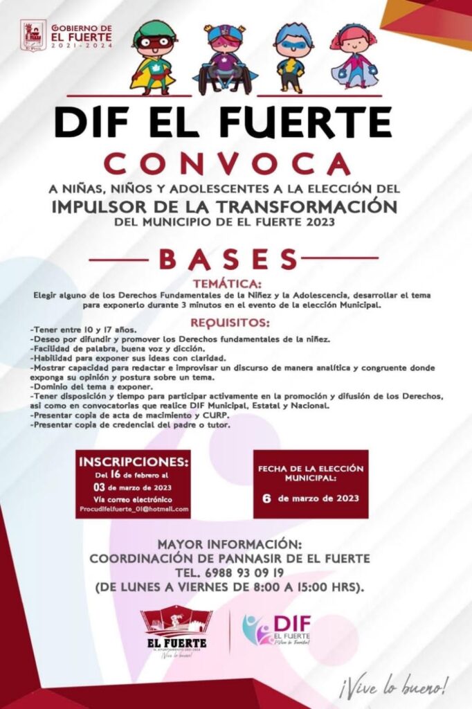 El Fuerte, Sinaloa, a 23 de febrero del 2023.- El Sistema para el Desarrollo Integral para la Familia de El Fuerte, invita a todos los niños y niñas de entre 10 y 17 años a participar en el concurso Impulsor de la Transformación 2023 que tiene como tema “Los derechos fundamentales de la niñez y de la adolescencia.