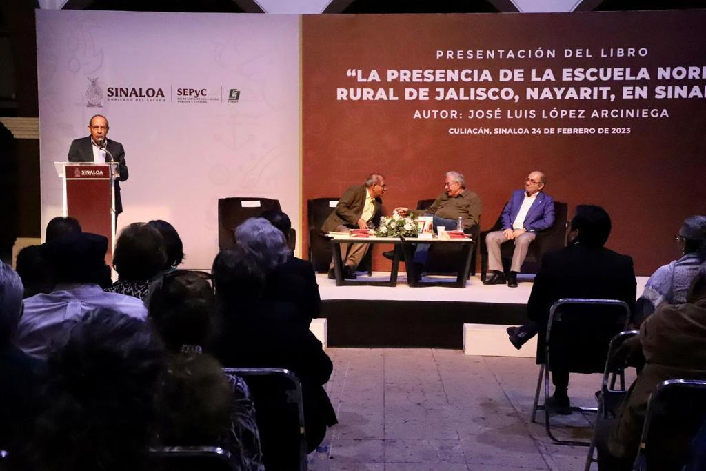 Culiacán, Sinaloa, a 24 de Febrero de 2023.- En reconocimiento al significativo lugar que se ganó en la historia educativa de México al formar maestros con espíritu nacionalista, con vocación de servicio y sobre todo, preparados para luchar contra el analfabetismo, los fanatismos de la época y con los cimientos necesarios para construir las bases de la identidad nacional actual, esta tarde, el escritor José Luis López Arciniega presentó su libro “La presencia de la Escuela Normal Rural de Jalisco, Nayarit, en Sinaloa”, en las instalaciones del Centro Sinaloa de las Artes “Centenario”, histórico recinto que fungió como sede de este emotivo evento que tuvo como invitado de honor al Gobernador Rubén Rocha Moya, quién a través de sus comentarios destacó el aporte cultural de esta obra, editada por el Colegio de Bachilleres del Estado de Sinaloa que dirige Santiago Inzunza Cázarez.