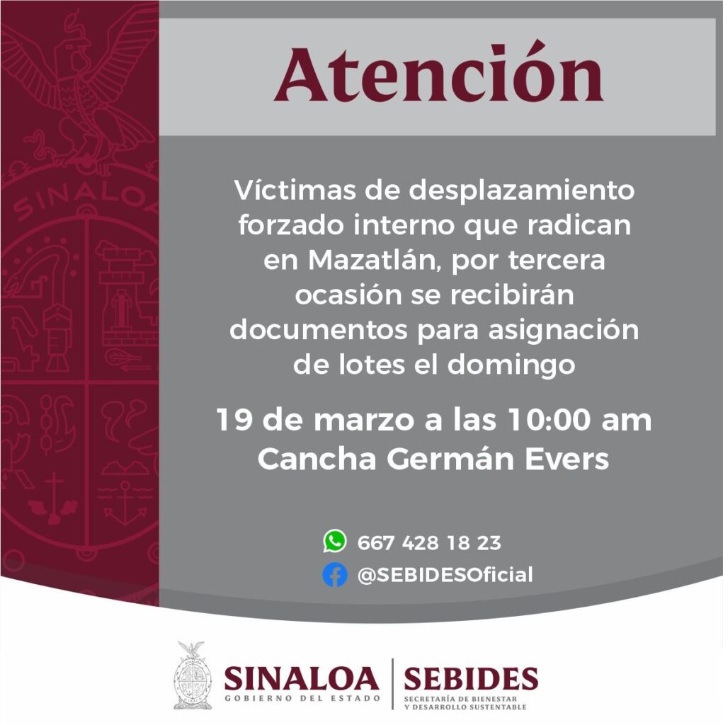 “Por tercera ocasión estaremos recibiendo documentos para posterior asignación de lotes en Mazatlán, será el domingo 19 de marzo a las 10 de la mañana en la Cancha Germán Evers. Este proceso lo hemos venido haciendo en el estado, ya lo hicimos en Sinaloa Municipio, en Guasave y Concordia… es solo para víctimas de desplazamiento forzado interno que radican en Mazatlán”, explicó.