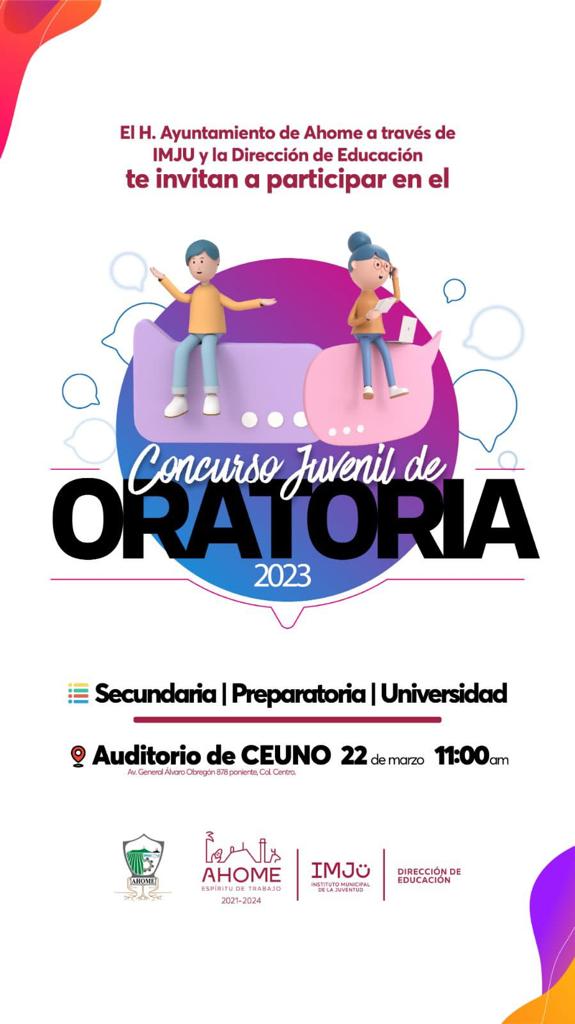Los Mochis, Ahome, Sinaloa a 15 de Marzo del 2023.- El Ayuntamiento de Ahome, a través de Instituto Municipal de la Juventud IMJU Ahome y la Dirección de Educación, invitan a los estudiantes de secundaria, preparatoria y universidad, de 12 a 29 años, a participar en el Concurso Juvenil de Oratoria 2023, el cual se llevará a cabo el próximo 22 de Marzo.