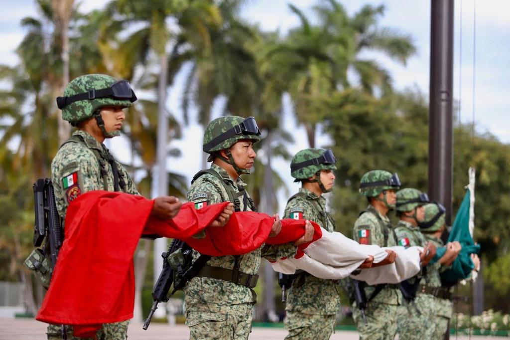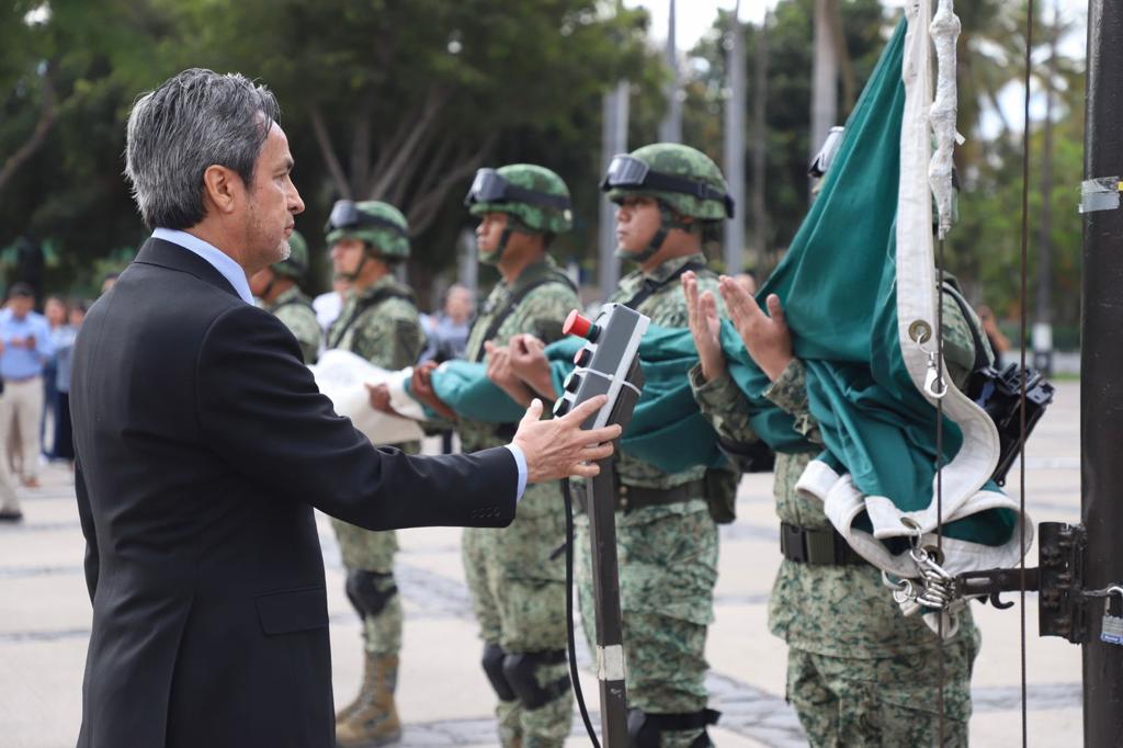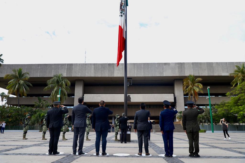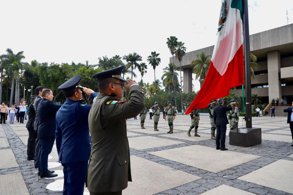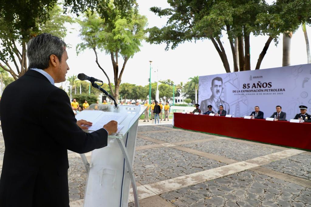 Culiacán, Sinaloa, 18 de marzo del 2023.- Autoridades civiles y militares conmemoraron el aniversario número 85 de la Expropiación Petrolera por el general Lázaro Cárdenas con un izamiento de bandera a toda asta y con Honores de Ordenanza en la plaza cívica de Palacio de Gobierno.