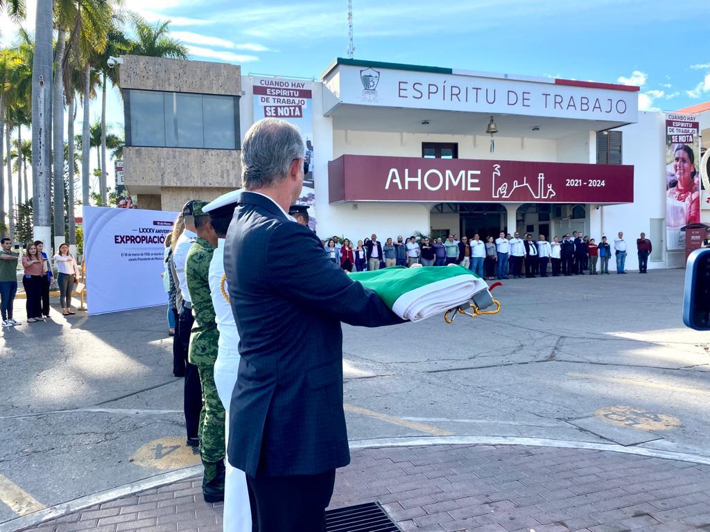 Los Mochis, Ahome, Sinaloa, a 18 de Marzo del 2023.- Autoridades municipales, militares, educativas, agrupaciones masónicas y ciudadanos, encabezados por el Secretario del Ayuntamiento Genaro García Castro, realizaron ceremonia cívica en Palacio Municipal, con izamiento de Bandera a toda asta, y montaron guardia y ofrenda de honor ante los monumentos del Gral. Lázaro Cárdenas del Río, para conmemorar el 85 aniversario de la Expropiación Petrolera.