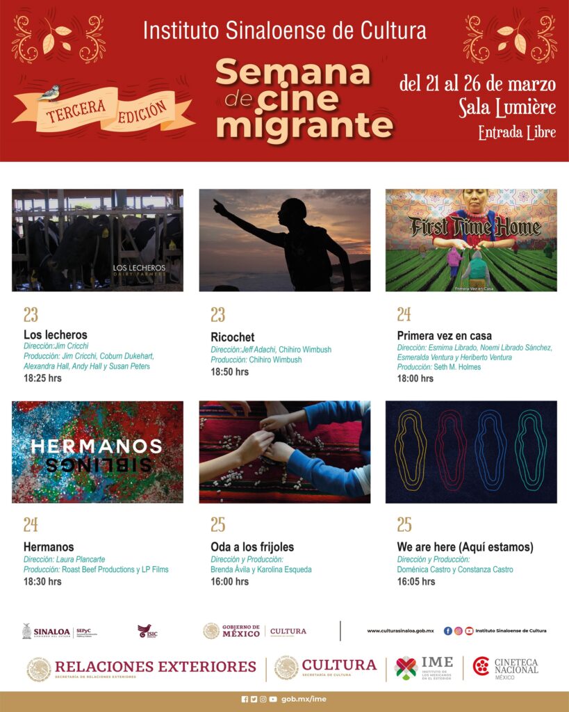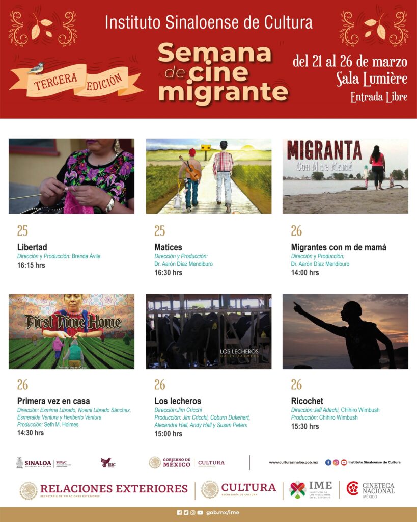 La Semana del Cine Migrante en Culiacán, concluye el domingo 26 de marzo y se realiza en coordinación con la Cineteca Nacional, y a su vez, cuenta con el apoyo del Instituto de los Mexicanos en el Exterior y la Secretaría de Cultura.
