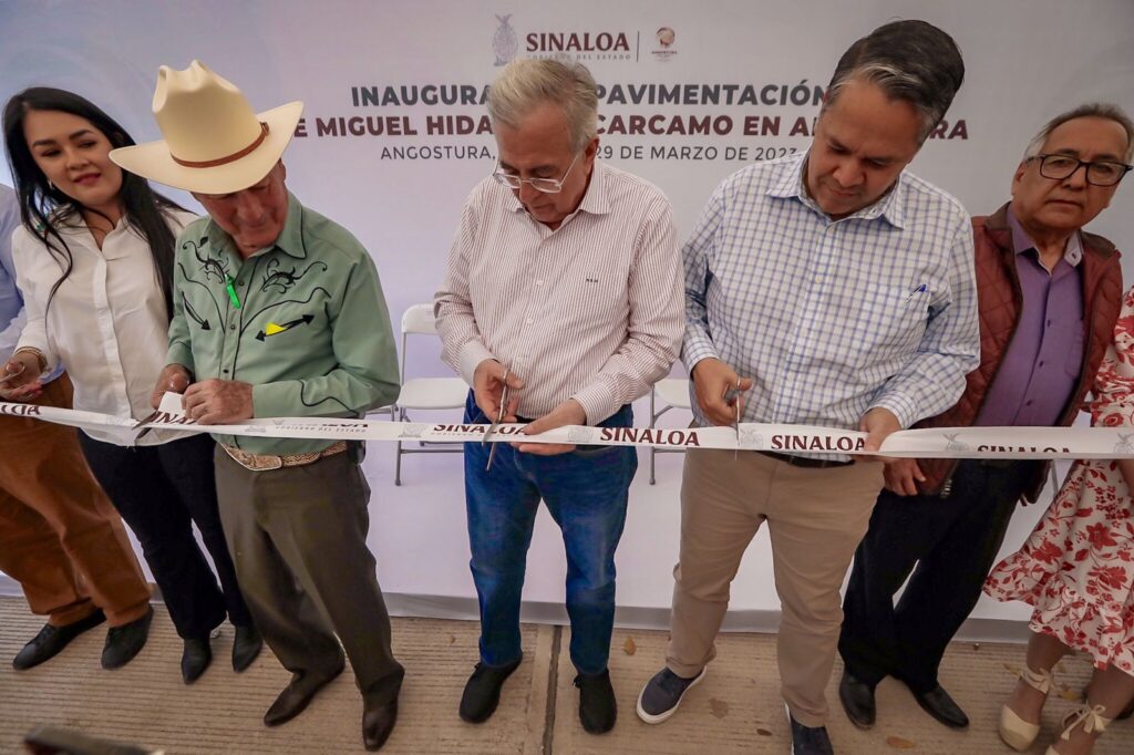 Posteriormente, los funcionarios encabezados por el Gobernador Rubén Rocha Moya acudieron al cruce de las calles Miguel Hidalgo y Narciso Mendoza, en la cabecera municipal, donde se hizo entrega de un tramo de pavimentación de 150 metros lineales y un arroyo de 11 metros de ancho, con banquetas e introducción de servicios, en una primera etapa, cuya inversión fue de 7 millones 402 mil pesos.