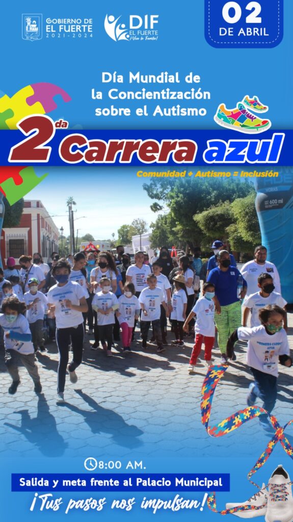 El Fuerte, Sinaloa, a 30 de marzo del 2023.- El H. Ayuntamiento de El Fuerte, a través del Sistema para el Desarrollo Integral para la Familia, hace una atenta invitación a la ciudadanía a participar el próximo domingo 02 de abril en la 2da. Carrera Azul, esto por motivo a la conmemoración del Día Mundial de la Concienciación sobre el Autismo, actividad que tiene como fin que la población tenga un acercamiento con las características del autismo y así empatizar con las personas que viven en el espectro y sus familias, y de esta forma contribuir a mejorar su calidad de vida y a participar en la sociedad en igualdad de condiciones.