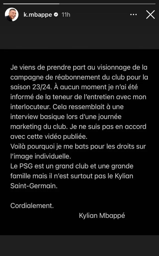 “En ningún momento mi interlocutor me informó sobre el destino que daría a la entrevista. Me pareció que era una entrevista típica de marketing del club. Me opongo a este vídeo publicado. Por eso lucho por los derechos individuales de imagen”, dijo el internacional francés en un mensaje en la red Instagram.