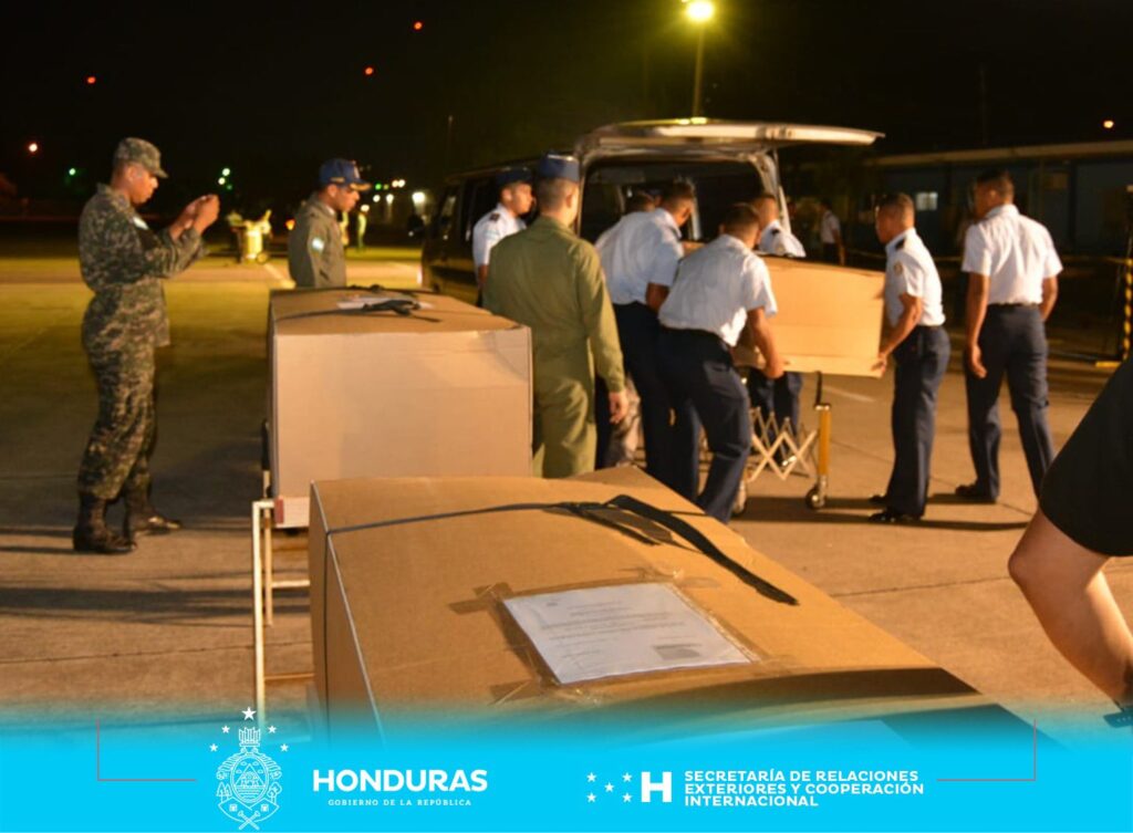 Los féretros fueron recibidos por el vicecanciller de Honduras, Antonio García, y la ministra de Derechos Humanos, Natalie Roque.
