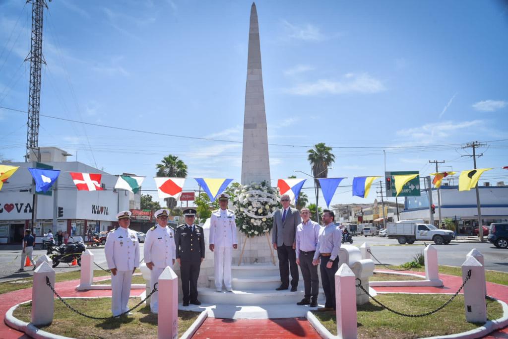 El Secretario del Ayuntamiento de Ahome, así como las autoridades presentes, acompañaron al Contralmirante Cuerpo General Diplomado de Estado Mayor Gerardo Tena López en la colocación de una ofrenda floral y montaron guardia de honor en el Obelisco Erigido a los Héroes Navales.
