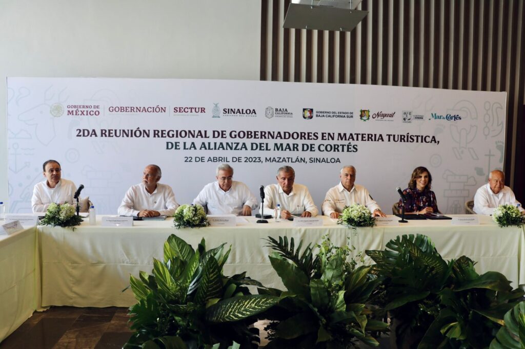 Mazatlán, Sinaloa, a 22 de Abril de 2023.- Concebida como una estrategia interestatal para fortalecer los vínculos entre las entidades a través de políticas, estrategias y acciones concurrentes por los tres órdenes de gobierno para incrementar los flujos de visitantes e inversiones, además de estrechar la cohesión de los mexicanos mediante el turismo, esta tarde, el Gobernador Rubén Rocha Moya fungió como anfitrión de la II Reunión Regional de Gobernadores en Materia Turística de la Alianza del Mar de Cortés, encabezada por el Secretario de Gobernación, Adán Augusto López Hernández y por el Secretario de Turismo, Miguel Torruco Marqués, en la que se realizó la Firma del Convenio de la Alianza, acción que consolida las futuras actividades a realizarse.