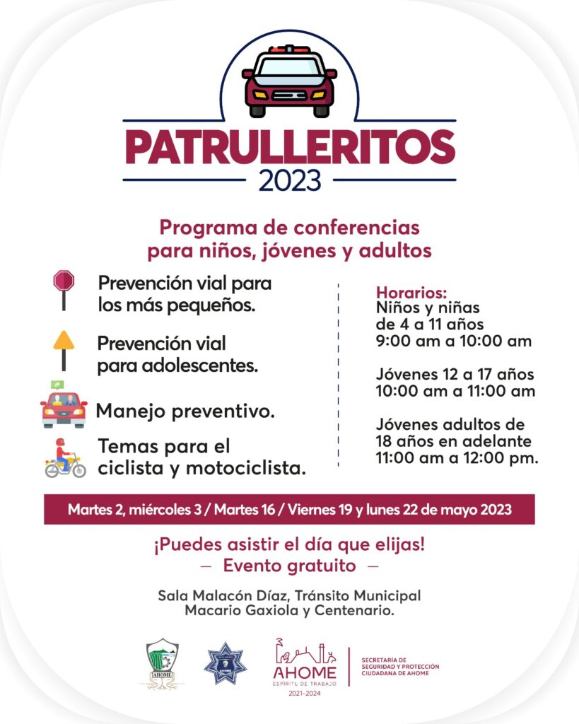 Los participantes podrán elegir el día que deseen asistir a estas conferencias, el martes 2 de mayo arrancará el programa, continuará el miércoles 3 de mayo. Se reanudará el martes 16, viernes 19 y concluirá el lunes 22 de mayo en la Sala Malacón Díaz de Tránsito Municipal, ubicada en bulevar Macario Gaxiola y Centenario.
