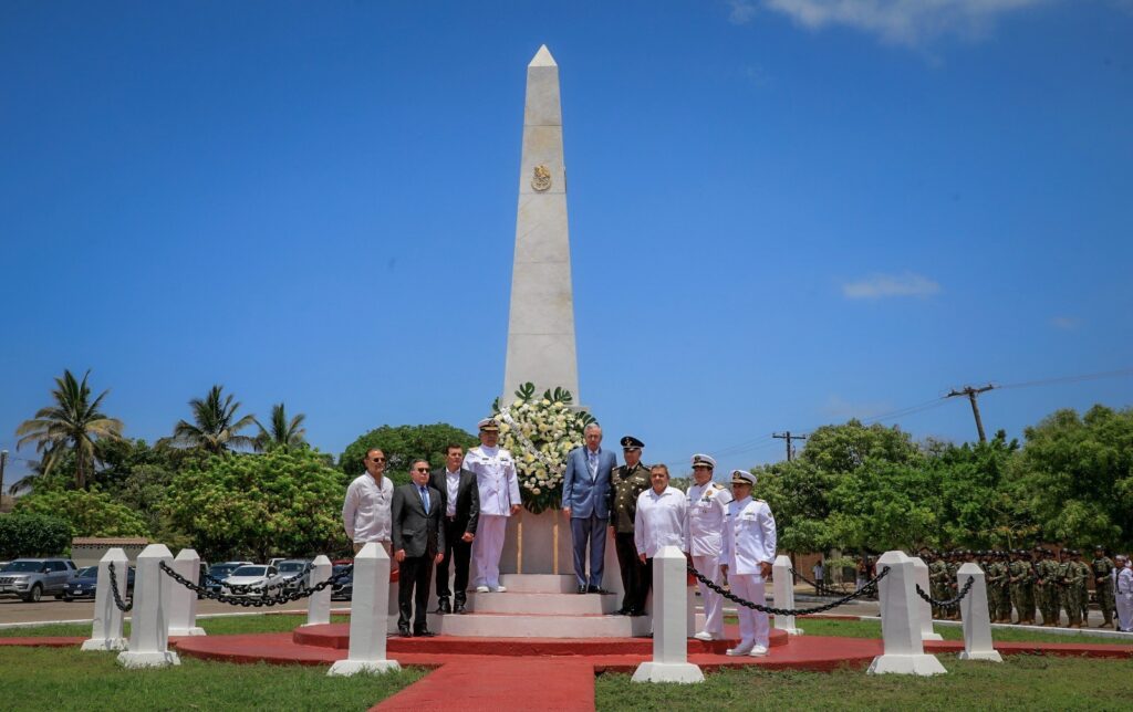 Como parte de la ceremonia, el gobernador Rocha y el almirante Abarca, encabezaron la guardia de honor y colocación de ofrenda floral en el Monumento al Marino Caído, junto con las demás autoridades invitadas, mientras la Banda de Guerra de la Escuela Náutica Mercante de Mazatlán, entonó marcialmente el Toque de Silencio.