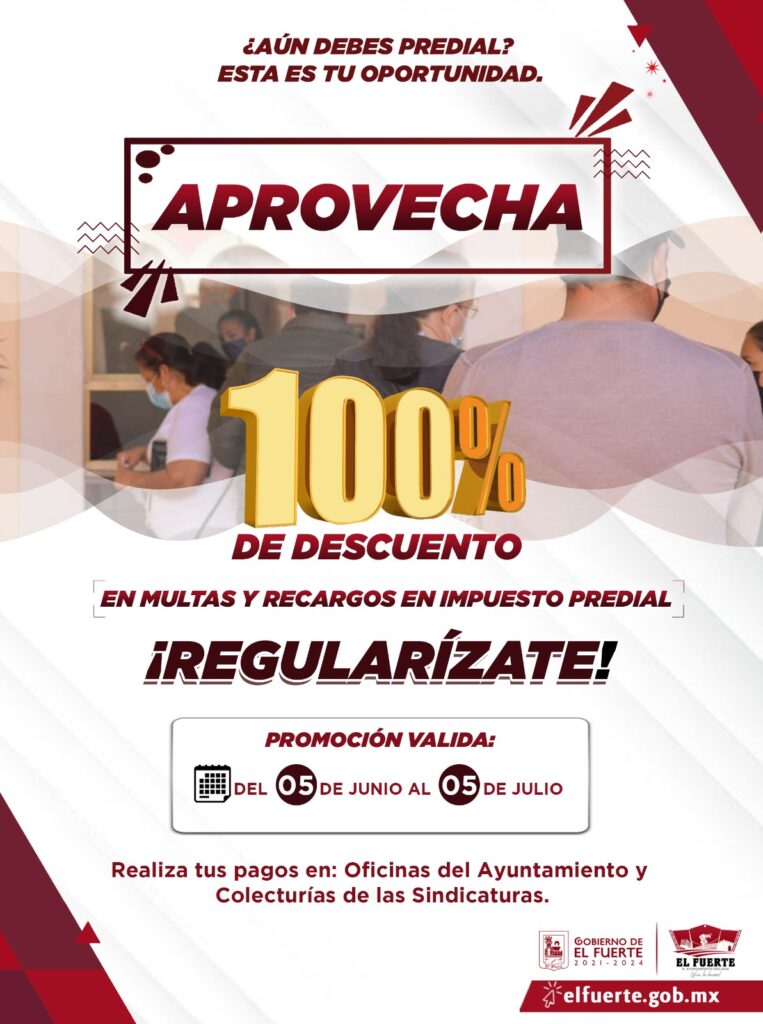 El Fuerte, Sinaloa, 02 de junio del 2023-. El H. Ayuntamiento de El Fuerte, a través de la Dirección de Ingresos, invita a la ciudadanía fortense para que aprovechen los descuentos en el pago de predial urbano con vigencia del 05 de junio al 05 julio del año en curso, acudiendo a pagar en las oficinas del Ayuntamiento y las colecturías de las diferentes sindicaturas.