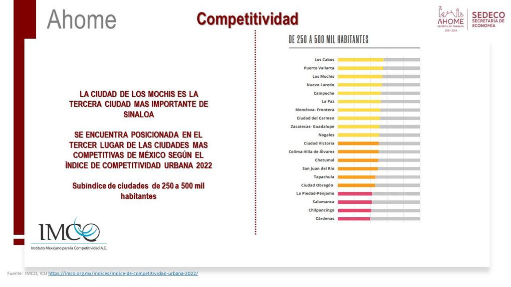 Con base en los resultados del análisis del IMCO, en Sinaloa, Ahome es de los sitos más favorables en temas de seguridad, economía y calidad de vida, en tanto que en otras ciudades del mismo rango que Los Mochis y Ahome, por la dimensión de habitantes, esta región del norte de Sinaloa es de las mejores 5 del país.