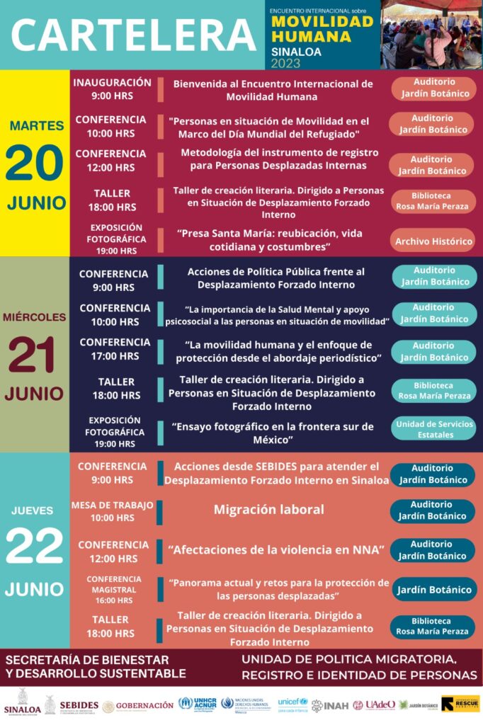 La Secretaría María Inés Pérez Corral explicó que, en el marco del Día Mundial de los Refugiados, del 20 al 22 de junio de 2023, nuestro estado será sede de este encuentro organizado por SEBIDES y la Unidad de Política Migratoria Registro e Identidad de Personas de la Secretaría de Gobernación Federal en busca de generar conciencia y conocimientos sobre el desplazamiento forzado interno que se vive en Sinaloa, México y el mundo.