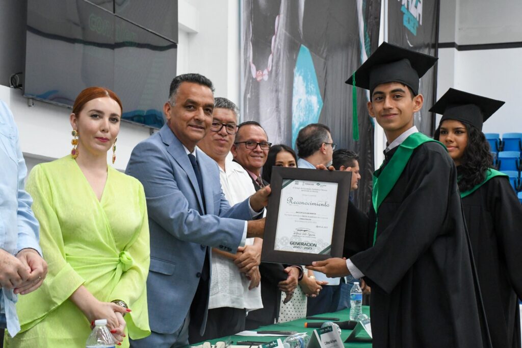 “De parte del Gobernador del Estado, les mando un afectuoso saludo, el Gobernador me ha instruido para saludar primeramente, porque así me lo dijo, salúdame a los padres de esos hijos que se están graduando y agradecerles de mi parte todo el esfuerzo que han hecho para que sus hijos se sigan preparando porque no es poca cosa jóvenes, realmente llegar a este nivel que ustedes han llegado, no todos llegan y lo he dicho en algunas intervenciones, del 100% de personas que inician sus estudios a temprana edad solamente el 37% llega a estar saludado, ustedes están saludados, por eso el Gobernador me reconoce esa parte y les mando a saludar a sus padres, pero también a ustedes que son jóvenes de bien y que saben lo que quieren para su propia existencia” señaló el director.