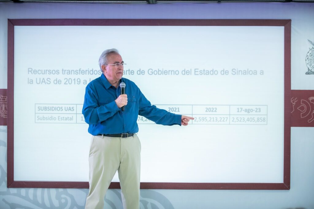 Tras señalar que desde el inicio de su administración se ha incrementado de manera exponencial el subsidio estatal para la universidad, Rocha Moya recordó que además, se está brindando un apoyo extraordinario de 120 millones de pesos mensuales para que la Universidad Autónoma de Sinaloa pueda pagar créditos fiscales contraídos ante el Servicio de Administración Tributaria.