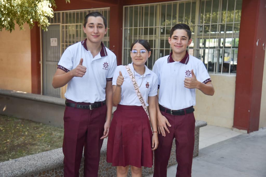 Los alumnos Azel Hiram Gámez Chávez, Ana Cristina Ahumada Bajo y Paola Avendaño Bojórquez, recibieron de manera simbólica en representación de los estudiantes ahomenses los paquetes gratuitos de libros, uniformes y útiles escolares.