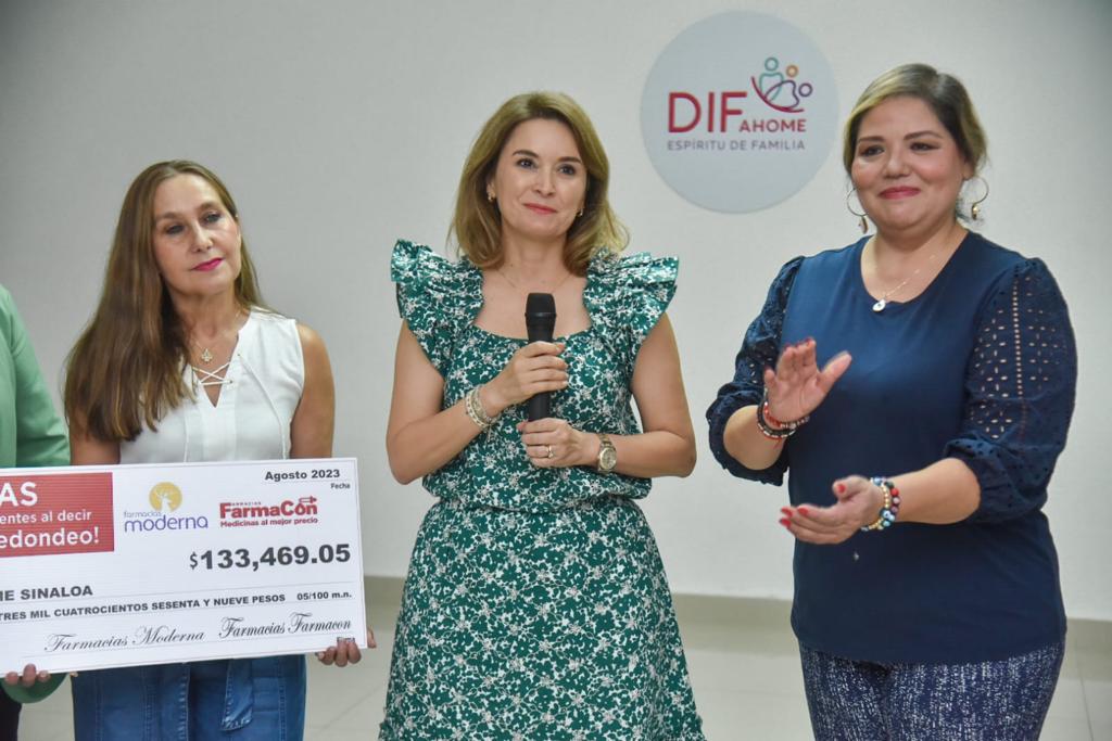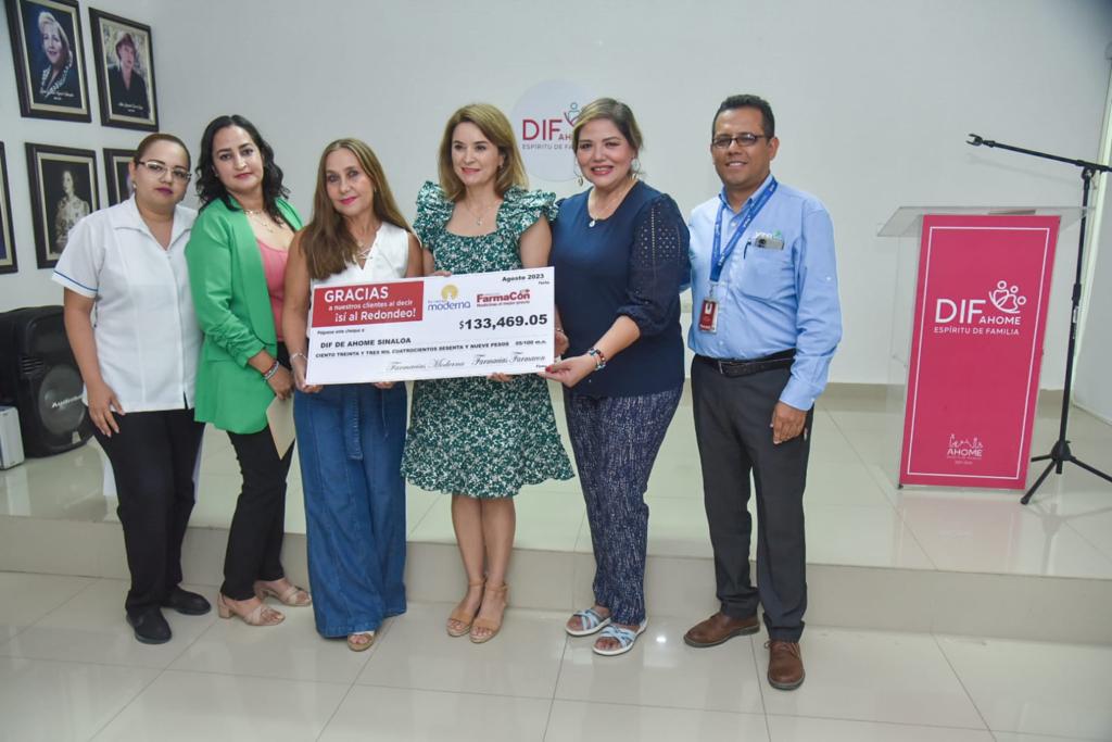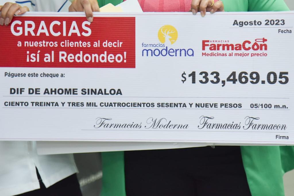 Los Mochis, Sinaloa, a 29 de Agosto del 2023.- Como parte de la campaña de redondeo de Farmacias La Moderna y FarmaCon, el Sistema DIF Ahome recibió de dicho corporativo una donación de poco más de 133 mil, los cuales se destinarán para el equipamiento de la Unidad Básica de Rehabilitación Los Laureles.