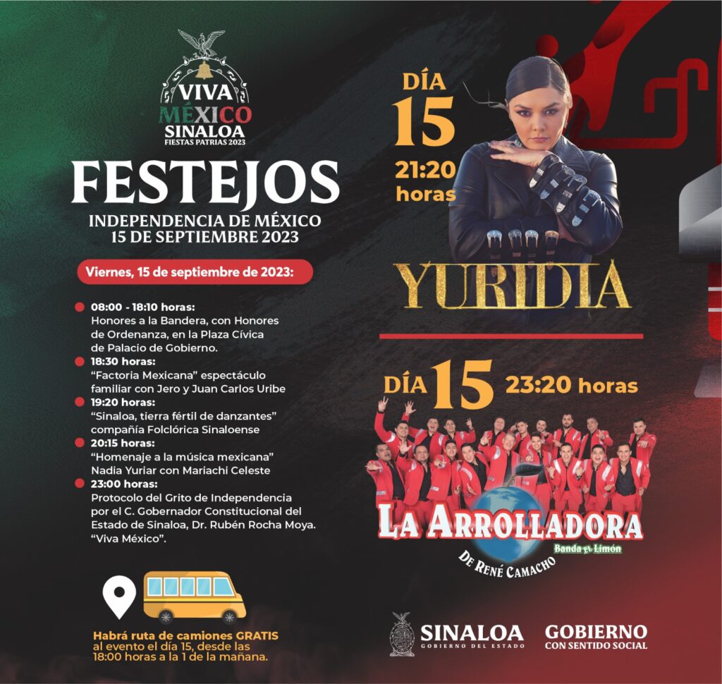 Una de las dos presentaciones estelares de la noche iniciará a las 9:20, que será el espectáculo de la cantante Yudiria, quien deleitará a los miles de asistentes con sus melodías que la han posicionado como una de las mejores y más exitosas intérpretes de México, para enseguida dar paso a las 11 de la noche a la celebración del Grito de Independencia por parte del gobernador Rocha.