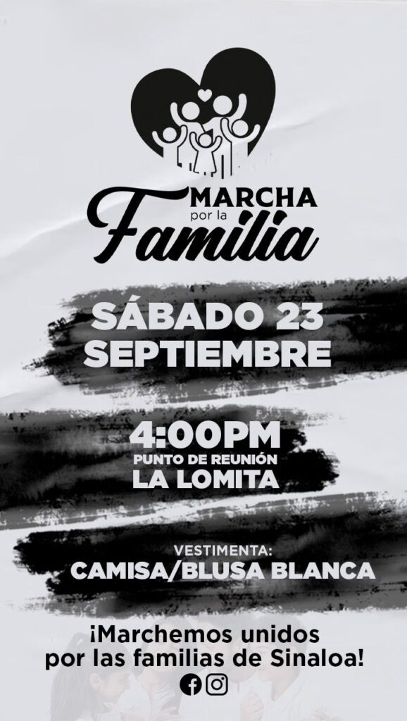 A través de su conferencia de prensa que emitió el presidente estatal del Partido Sinaloense (PAS), MC. Héctor Melesio Cuén Ojeda anunció la gran Marcha por la Familia que se llevará a cabo el próximo sábado 23 de septiembre del 2023 a las 5 de la tarde partiendo de la Catedral hacia la “La Lomita” en la ciudad de Culiacán.