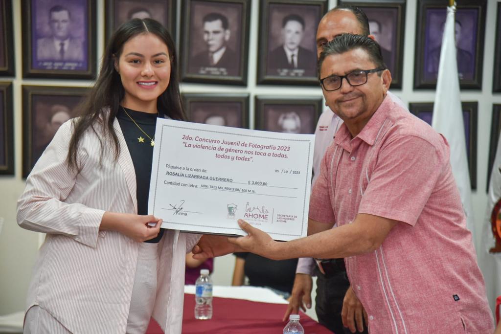 En una sencilla ceremonia en el salón de cabildo de Palacio Municipal, los jóvenes triunfadores recibieron placa de reconocimiento y un estímulo económico de manos de la titular de la Secretaría de las Mujeres de Ahome, María Magdalena Rocha, la Síndica Procuradora, Cecilia Hernández, que representó al Alcalde Gerardo Vargas Landeros, así como del Director de Educación, Sixto Rosas, además de los fotógrafos Ruth Angélica Medina León y Carlos Paulino Fonseca Monge, integrantes de la mesa del jurado calificador.