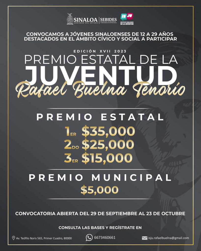 Los Mochis, Ahome, Sinaloa, a 6 de Octubre del 2023.- El Instituto Sinaloense de la Juventud (ISJU), en coordinación con el Instituto Municipal de la Juventud de Ahome (IMJU), presentaron la convocatoria del Premio Estatal “Rafael Buelna Tenorio”, que busca reconocer a los jóvenes que destaquen en ámbitos cívico, social y aporten bienestar a la ciudadanía Sinaloense.
