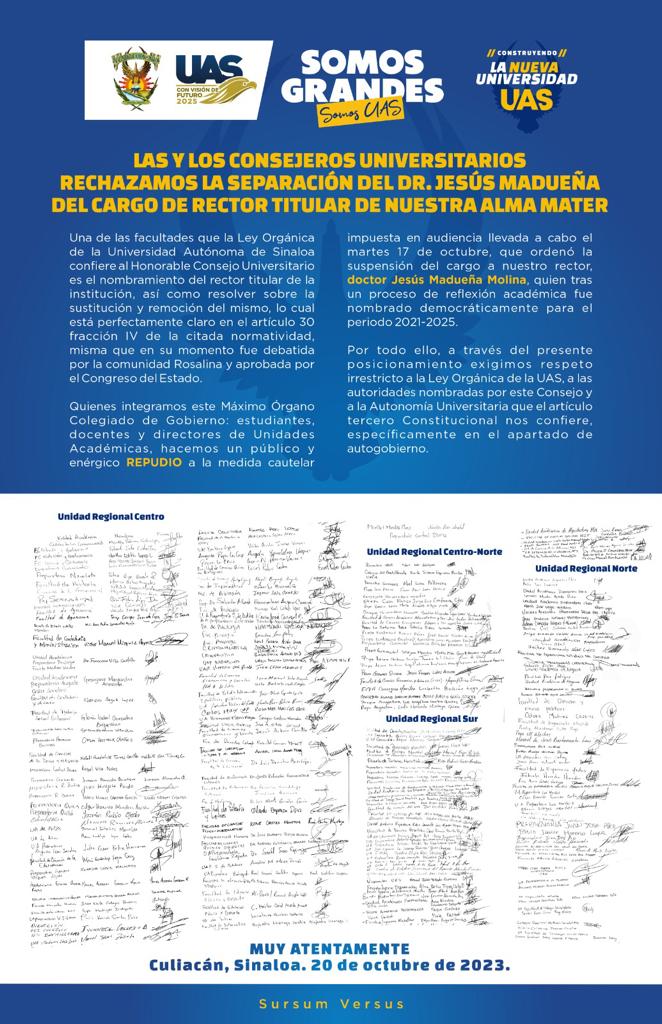 A este posicionamiento le fueron integradas las firmas de todos los consejeros universitarios de las cuatro unidades regionales que conforman la Universidad Autónoma de Sinaloa.