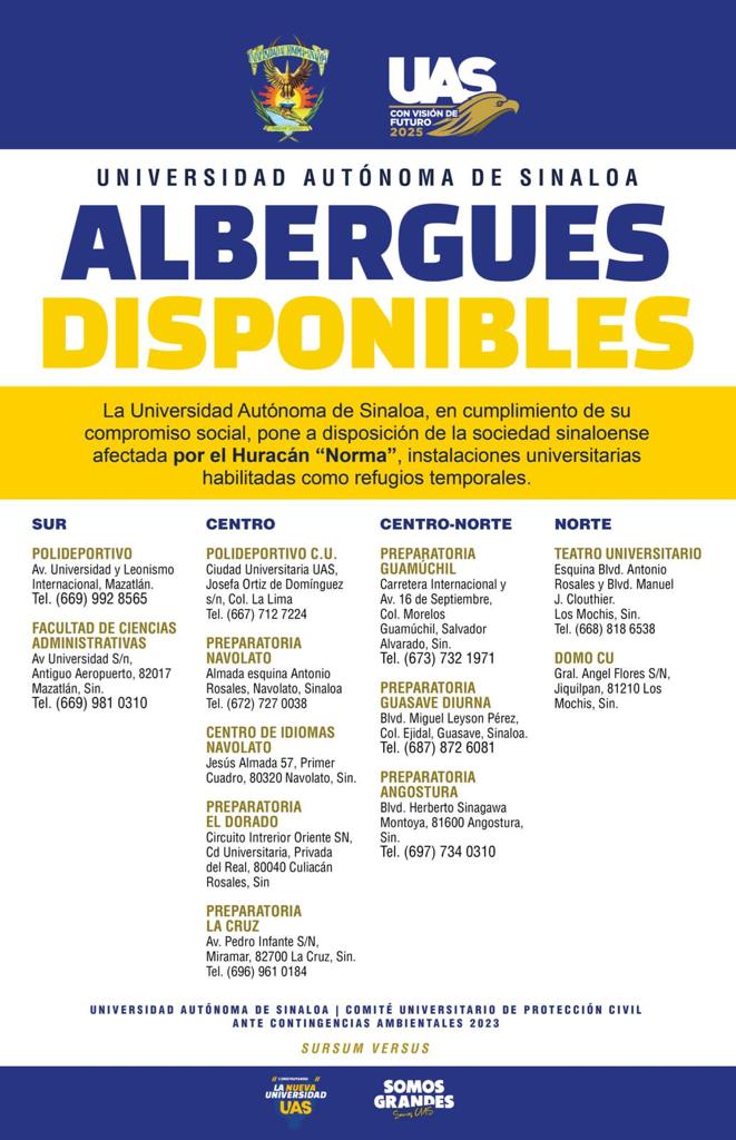 Frente al posible impacto del Huracán Norma en el estado, la Universidad Autónoma de Sinaloa (UAS) se solidariza con la población en riesgo y habilitó albergues en sus cuatro regiones académicas: Norte, Centro Norte, Centro y Sur, buscando con ello resguardar y proteger a los habitantes más vulnerables ante la llegada de este fenómeno natural.