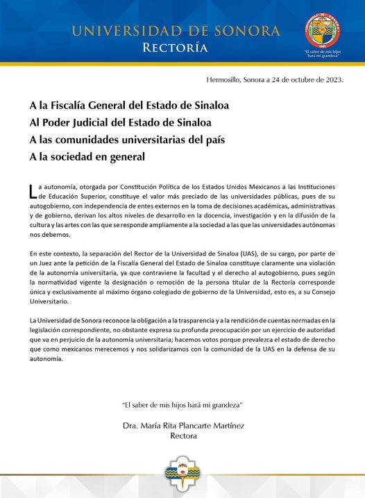 A través de un manifiesto dirigido tanto a la Fiscalía General del Estado como al Poder Judicial de Sinaloa, las comunidades universitarias del país y la sociedad en general, la Universidad de Sonora se pronunció en contra de la separación del cargo del Rector de la Universidad Autónoma de Sinaloa (UAS) por parte de un juez, pues ello representa una violación a la autonomía y el derecho al autogobierno de la Casa Rosalina.
