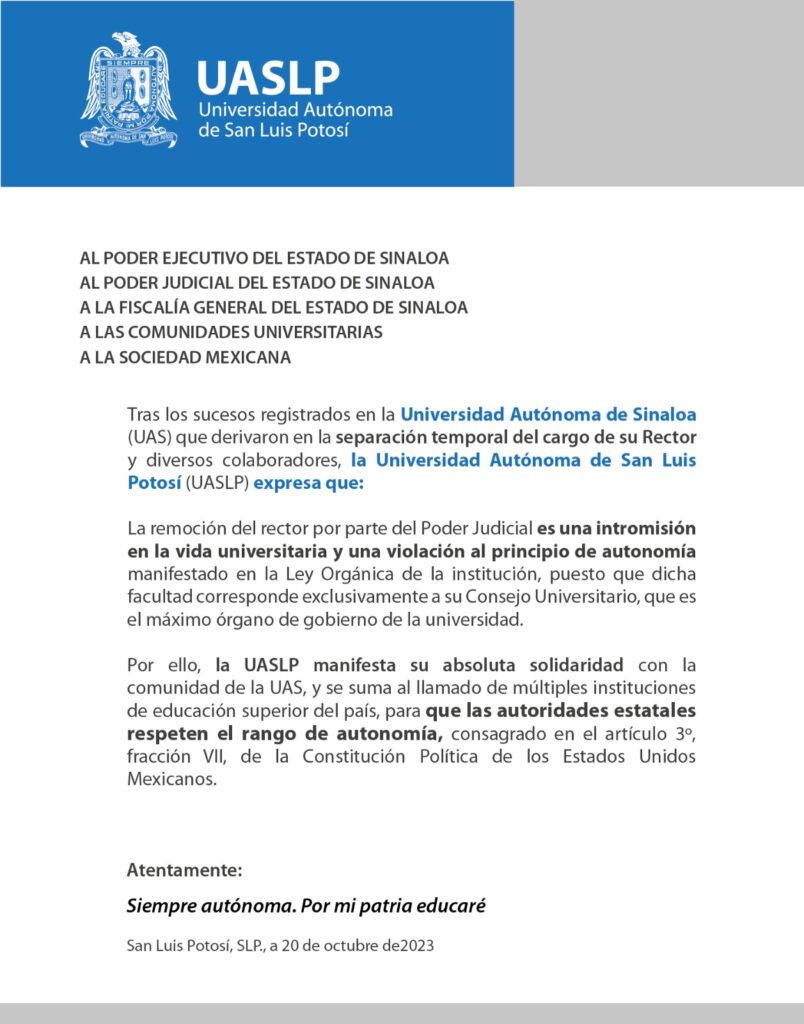 En un comunicado dirigido tanto al Poder Ejecutivo como al judicial, ambos del Estado de Sinaloa; a la Fiscalía General del Estado, a las comunidades universitarias y a la sociedad mexicana, la Universidad Autónoma de San Luis Potosí (UASLP) manifestó su solidaridad con la Universidad Autónoma de Sinaloa (UAS) ante la violación de su autonomía ante la remoción del Rector por parte de un juez, y solicitó que las autoridades estatales respeten dicho principio.