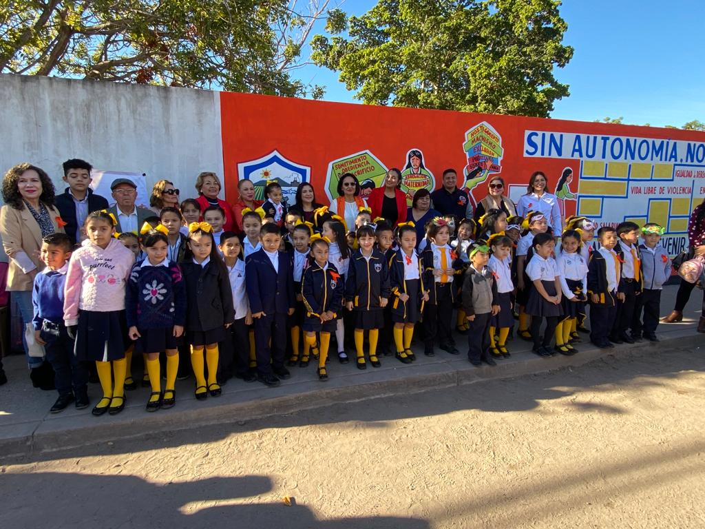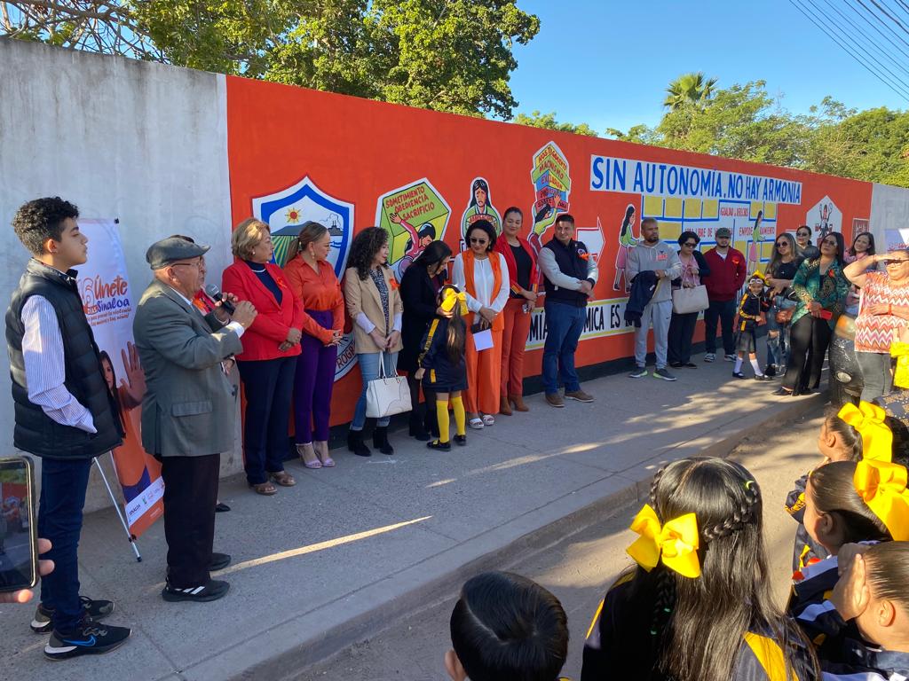 Los Mochis, Ahome, Sinaloa, a 5 de Diciembre del 2023.- Como parte de las actividades de la campaña “ÚNETE 16 Días de Activismo”, que realiza el Gobierno de Ahome a través de la Secretaría de las Mujeres (SEMUJERES), para visibilizar, atender, combatir y erradicar la violencia de género, contra mujeres, niñas y adolescentes, se inauguró el mural “Sin Autonomía no hay Armonía”, en la barda perimetral de la escuela primaria José María Morelos de la colonia Burócrata en la ciudad de Los Mochis.