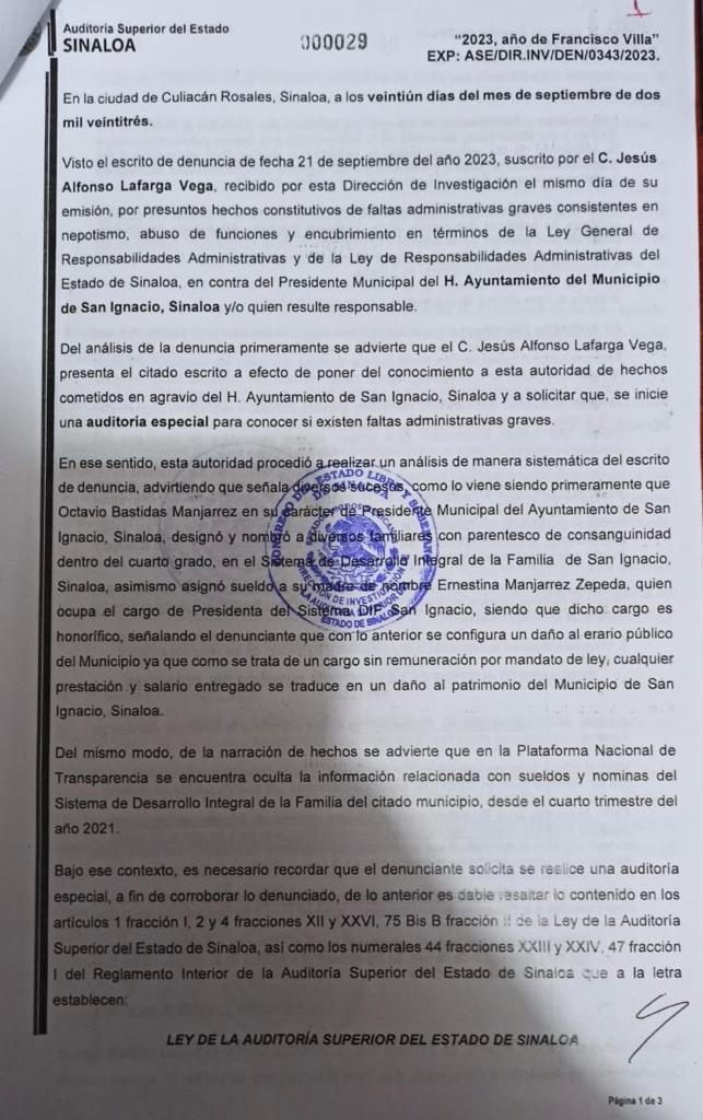Esto posterior a que el Regidor de San Ignacio Alfonso Lafarga denunció ante la ASE al Presidente Municipal de San Ignacio, Octavio Bastidas Manjarrez por Nepotismo en septiembre de 2023, debido a que tiene trabajando en el Ayuntamiento a varios familiares.