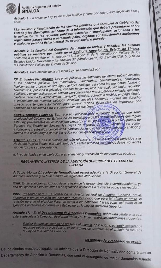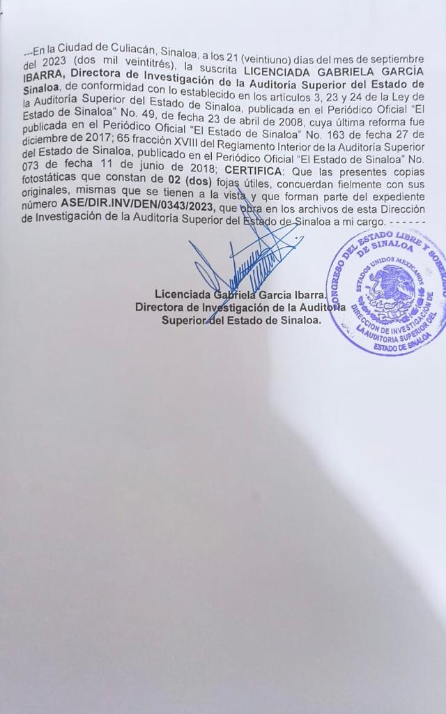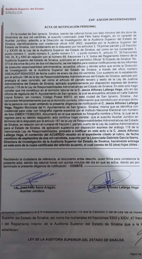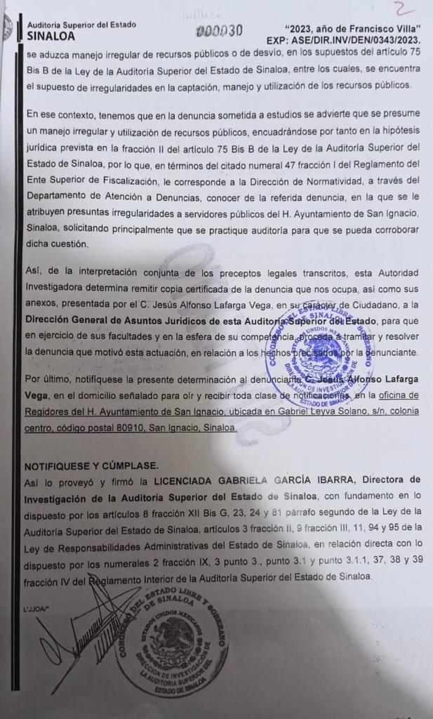 Ante ello la ASE respondió la denuncia y notificó al Regidor que se realizará una auditoría especial al Ayuntamiento de San Ignacio en los años 2021, 2022 y 2023 para revisar que en efecto haya familiares del Presidente trabajando en el ayuntamiento.