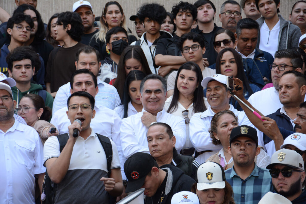 “Es el Gobierno que tiene Sinaloa, un gobierno fascista, un gobierno que está en contra de todo aquel que no piensa como ellos, que los persigue y que quiere desaparecernos del mapa de Sinaloa como lo ha hecho con los agricultores, como lo ha hecho con Los pescadores como lo ha hecho con aquellos que exigen seguridad”, expresó el Rector Titular, doctor Jesús Madueña Molina en la parte alta de la escalinata del Palacio de Gobierno.
