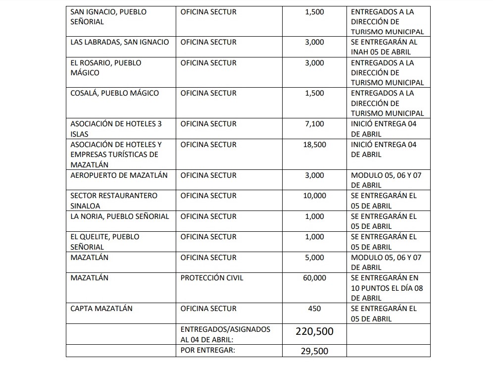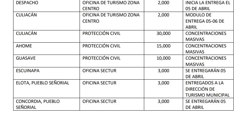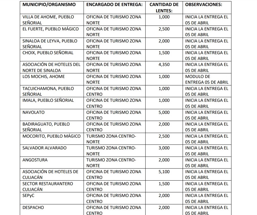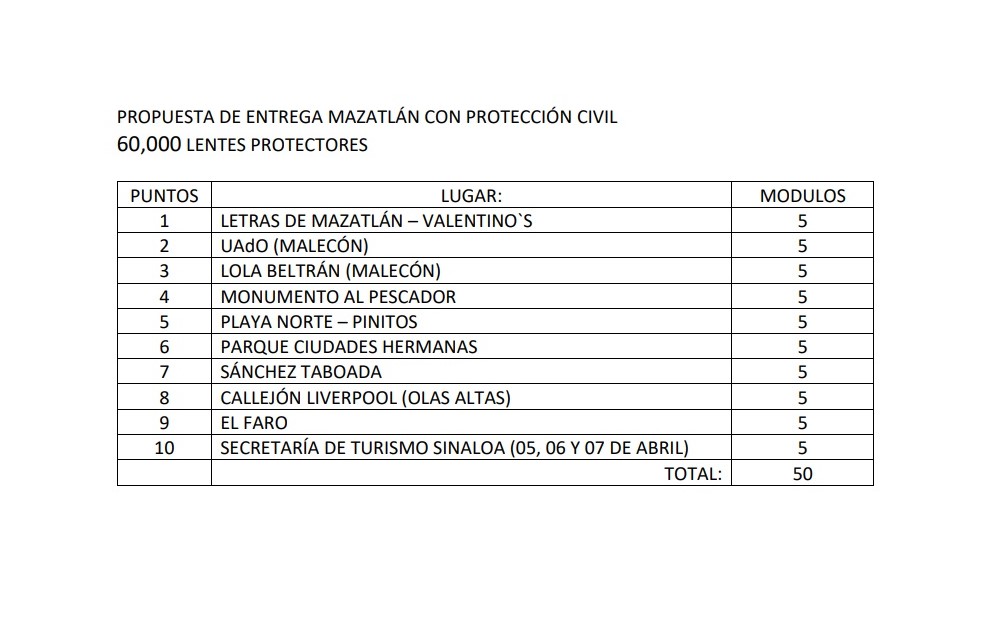 Desde este mismo viernes inició la entrega de los lentes en las oficinas de la Secretaría de Turismo en Mazatlán, y continuará durante sábado y domingo, mientras que para el lunes 8 de abril, desde las 5 de la mañana, continuará el reparto en 10 puntos de concentración ya establecidos, como son el parador turístico de las letras de Mazatlán junto al Valentinos, la UAdeO por el malecón, Monumento al Pescador, Playa Norte (Los Pinitos), Parque Ciudades Hermanas, Plazuela Rodolfo Sánchez Taboada (lugar del asta bandera monumental), Callejón Liverpool en Olas Altas, El Faro Mazatlán, y la propia Secretaría de Turismo.