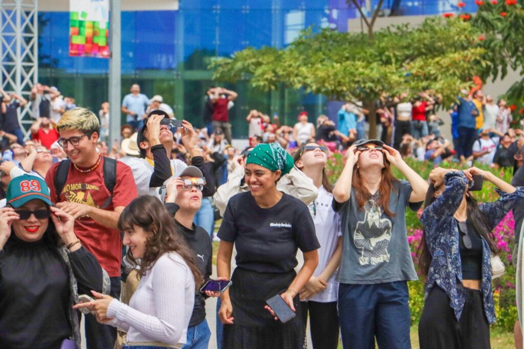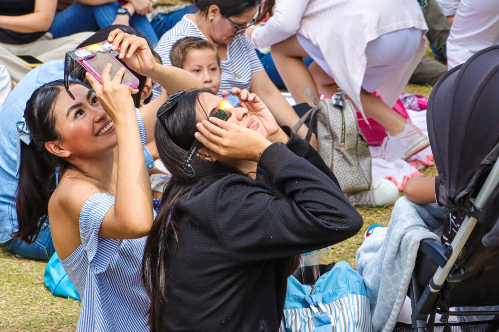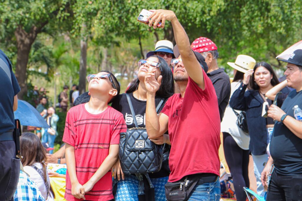 Además de observar las fases del eclipse a través de los lentes, las familias también lo disfrutaron en una pantalla instalada bajo las frondas de los árboles, donde se proyectó lo que se vivía en el lugar, alternadamente con tomas de lo que ocurría en Mazatlán y el portal de la NASA, en una transmisión en vivo por redes sociales a la que se conectaron 214 mil 596 usuarios.
